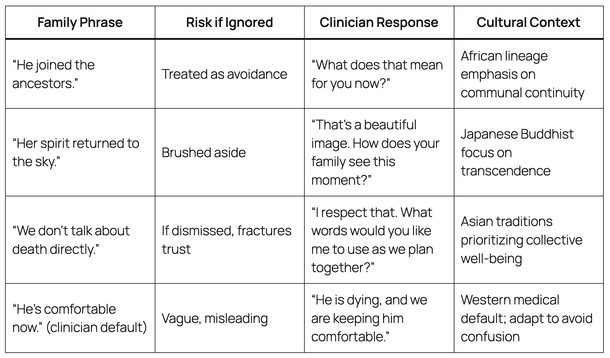For hospice clinicians, this is not just etiquette, it is language justice: ensuring end-of-life conversations align with cultural values to promote equity in care (Bigger et al., 2025).