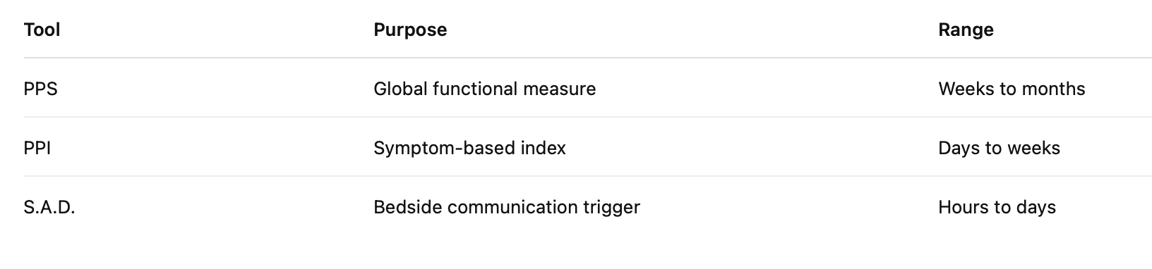 Even validated tools such as the Palliative Performance Scale (PPS) and Palliative Prognostic Index (PPI) yield probabilistic ranges, not certainties.